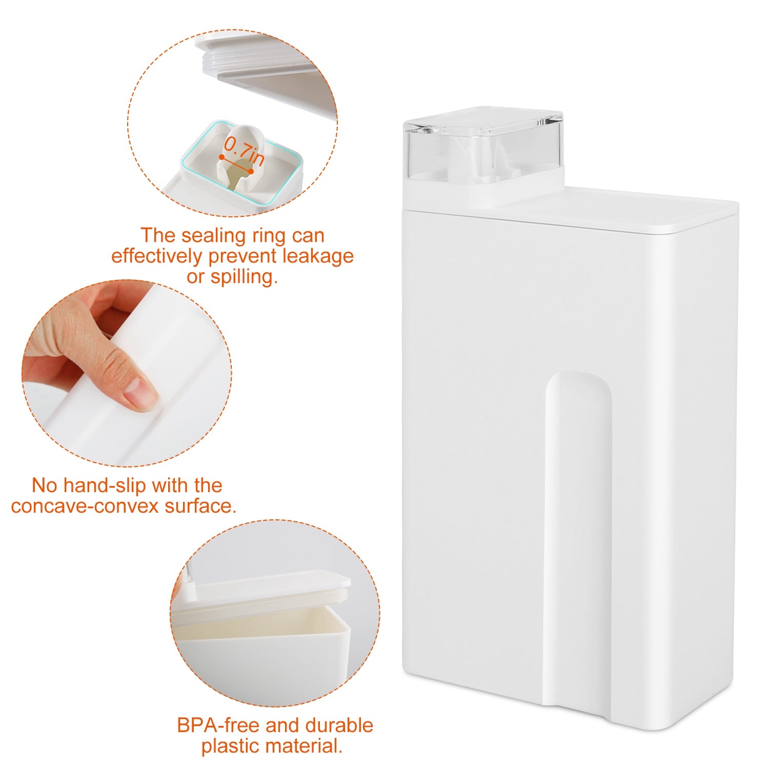 - *Large Capacity And Measuring Lid*:This dispenser can hold up to 35oz liquid detergent, requiring no frequent refilling. The sealing ring can effectively prevent leakage or spilling when not in use.