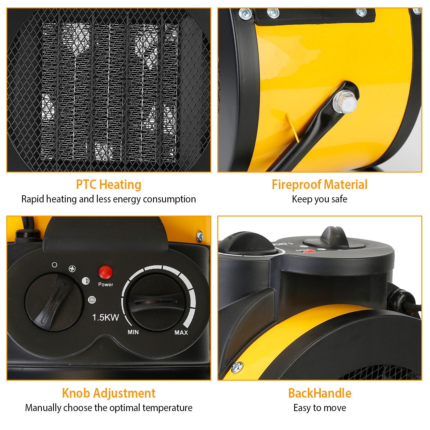- *3 Adjustable Modes*:This heater is equipped with natural wind mode,low heat mode, and high heat mode. The knob nearby allows you adjust the temperature at will. You can use it to promote air circulation or warm up your cold room.