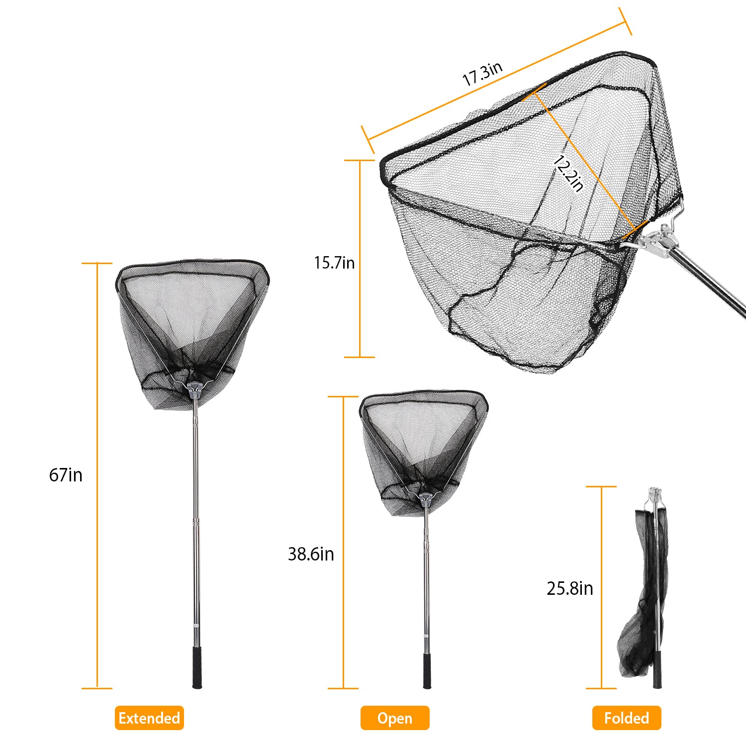 - *38.6in-67in Telescopic Rod*:The rod that extends from 38.6in-67in allows for extra reach required for a successful catch or release. The net with a size of 17.3x12.2x15.7in in triangular shape contributes to more stable and deeper fishing.