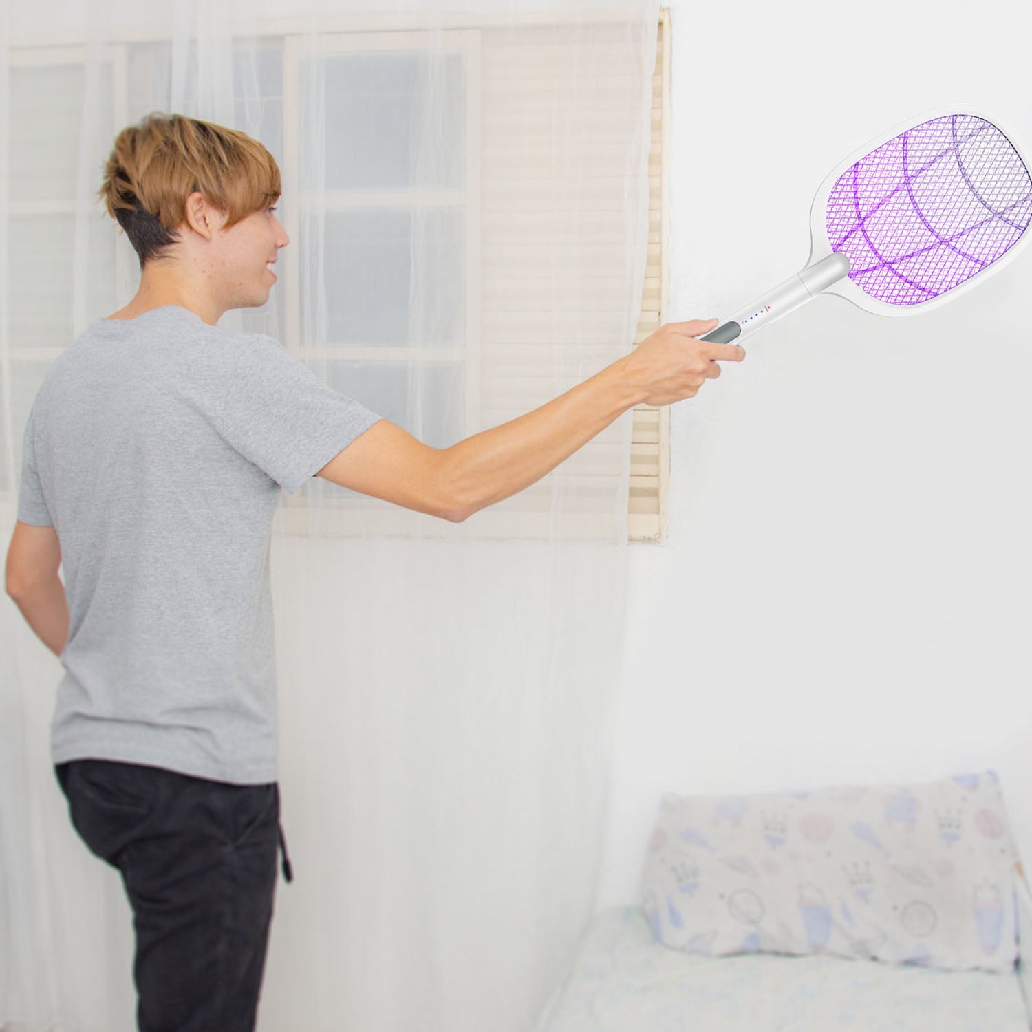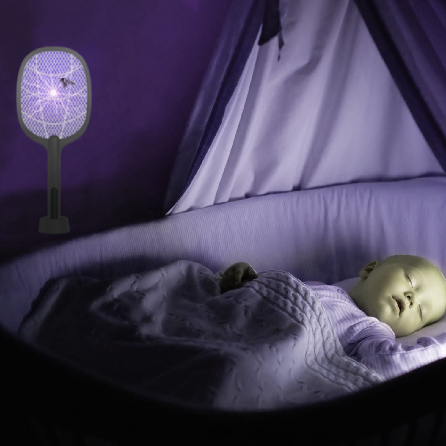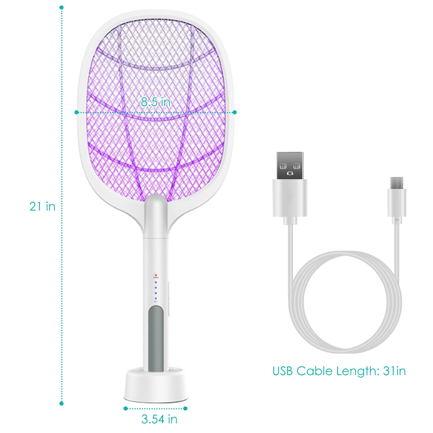 - *2 In 1 Bug Zapper Racket*:Not only a zapper racket but also a zapper lamp for you. At day, you can eliminate insects by a single swing in the air. At night, insert the racket into the base as a zapper lamp. The mosquitoes or other nocturnal insects will be attracted and then be zapped the moment they touch the metal grid. Protect you from annoying bite and prevent stored food from contamination.