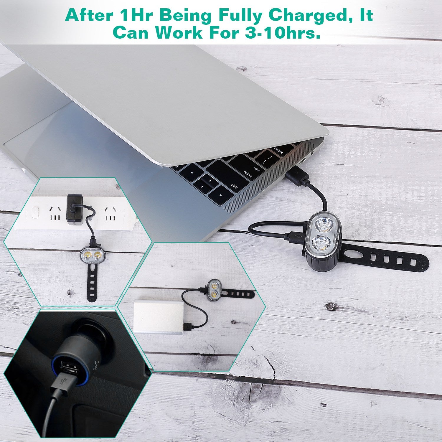 - *IPX4 Waterproof & Long-lasting*:Adopting high-grade materials and good sealing design, our bike front light and taillight are durable and can provide IPX4 water-resistant performance to withstand light or moderate rain. After 1Hrs being fully charged,it can work up to 3-12hrs.