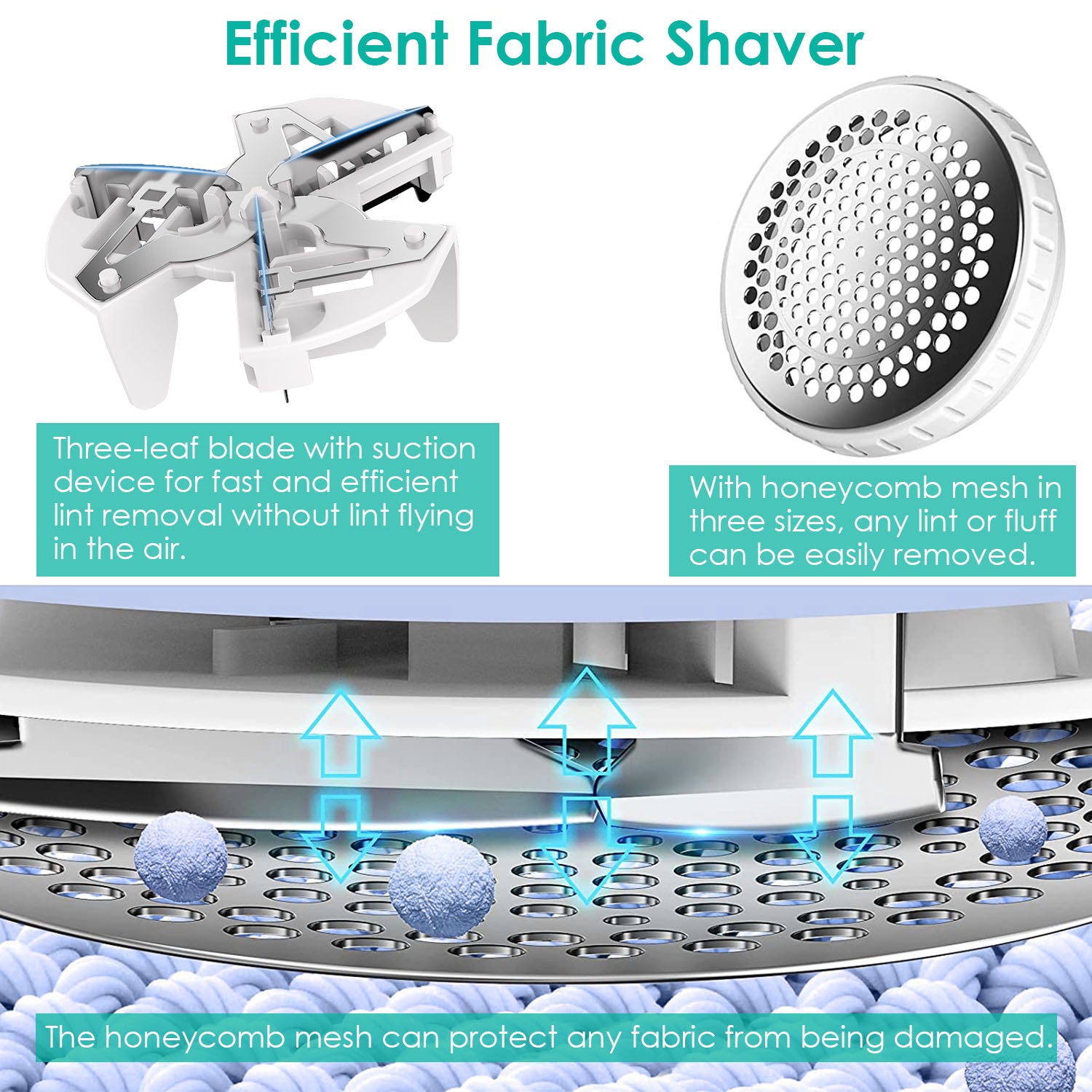 - *Efficient Lint Removal*:It adopts three-leaf blade with suction device for fast and efficient lint removal without flying lint in the air. The hollowed out blade also avoid fluff clogging effectively. Just press the remover over the fabric in a circular motion and the blade will shave off any fluff, lint, pills without damaging the fabric.
