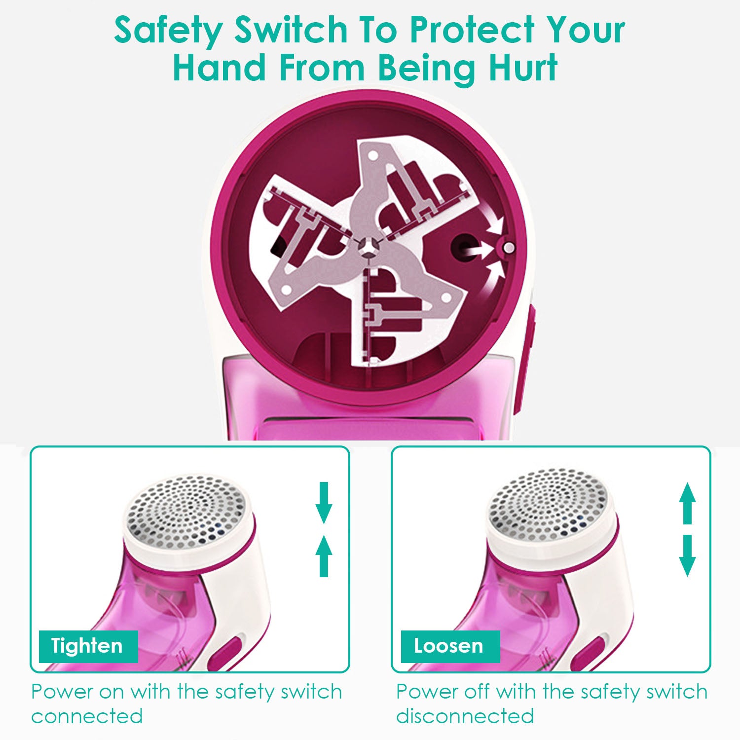 - *Dual Protections*:The honeycomb mesh can protect any fabric from being damaged. No need to worry about loosening yarns being sucked into the shaver. Besides, the safety switch can protect your hand from being hurt. When the blade cover is loose, the shaver will automatically cut off.