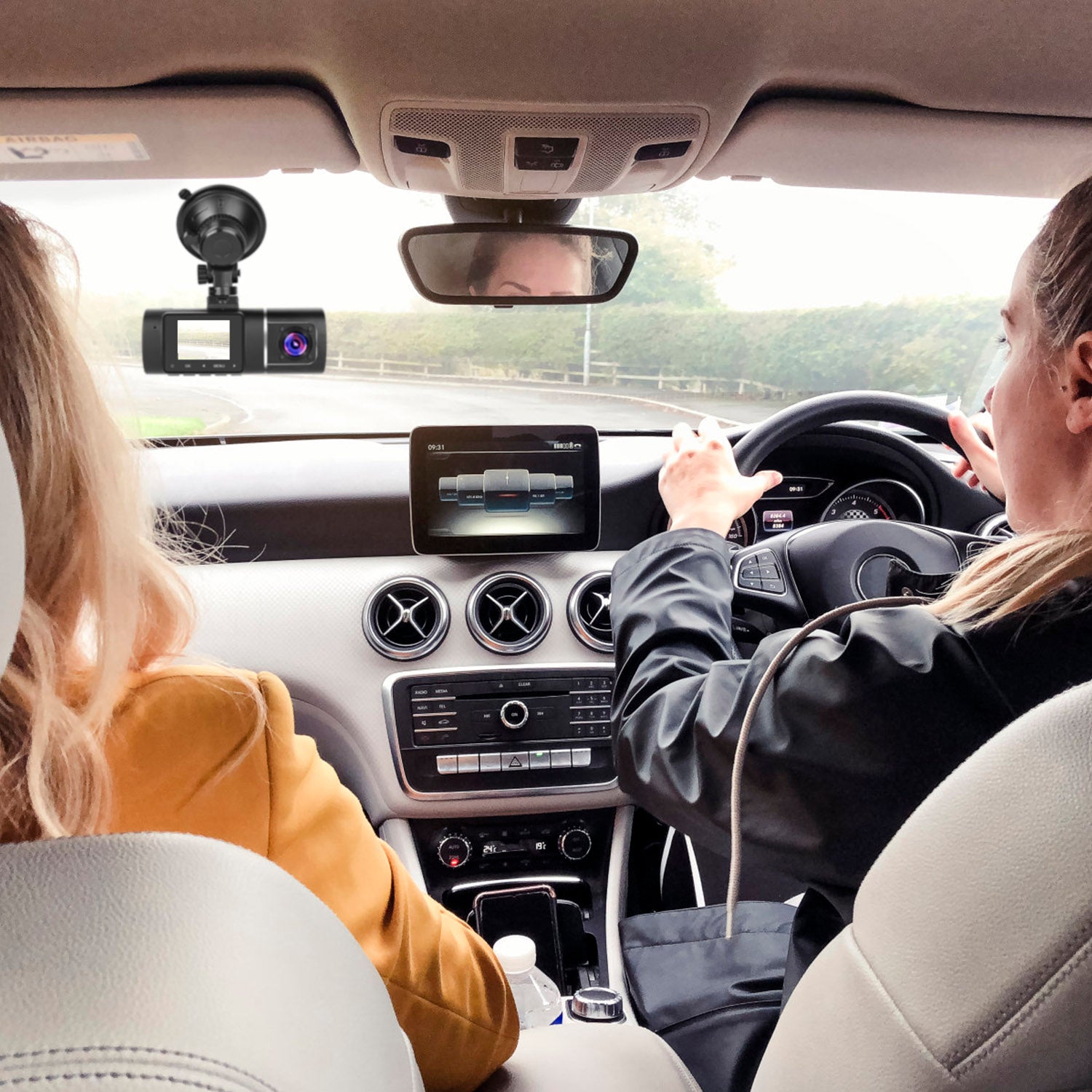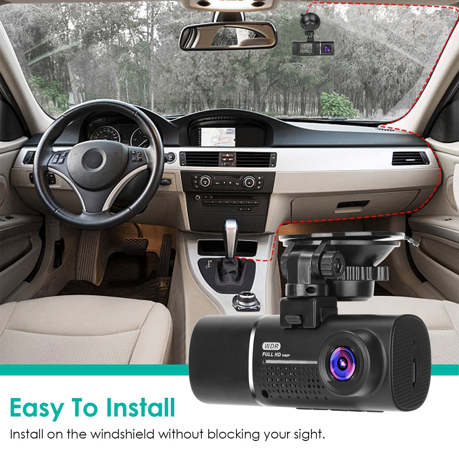 - *Dual Lens Dash Cam*:The 1080P front and 90° rotatable 720P inside cameras can record HD videos simultaneously,providing a great amount of details regardless of ambient light and weather conditions. With a field of vision of 170 degrees, it can capture more of what's going on at the sides of your car. Always keeping you informed of the road status and the baby status of rear car seat.