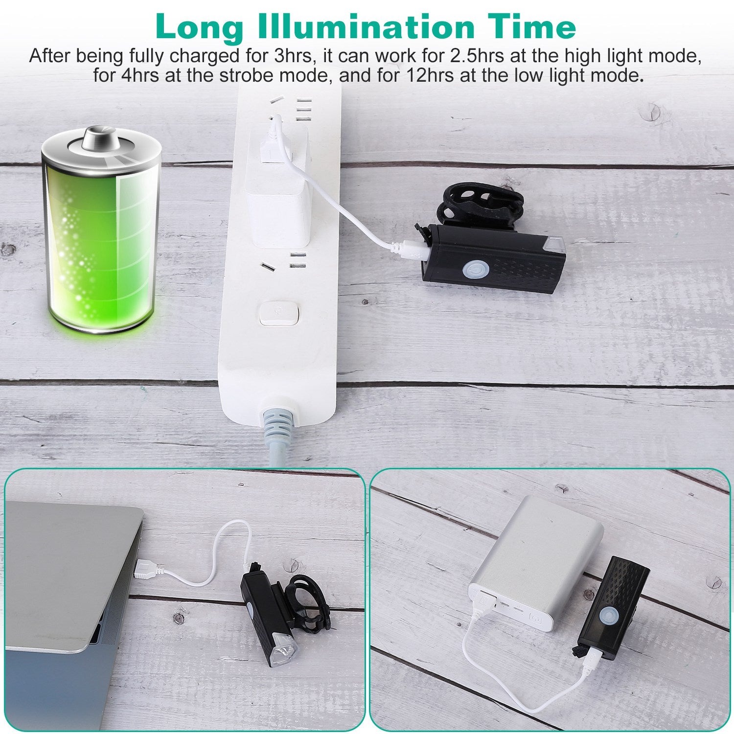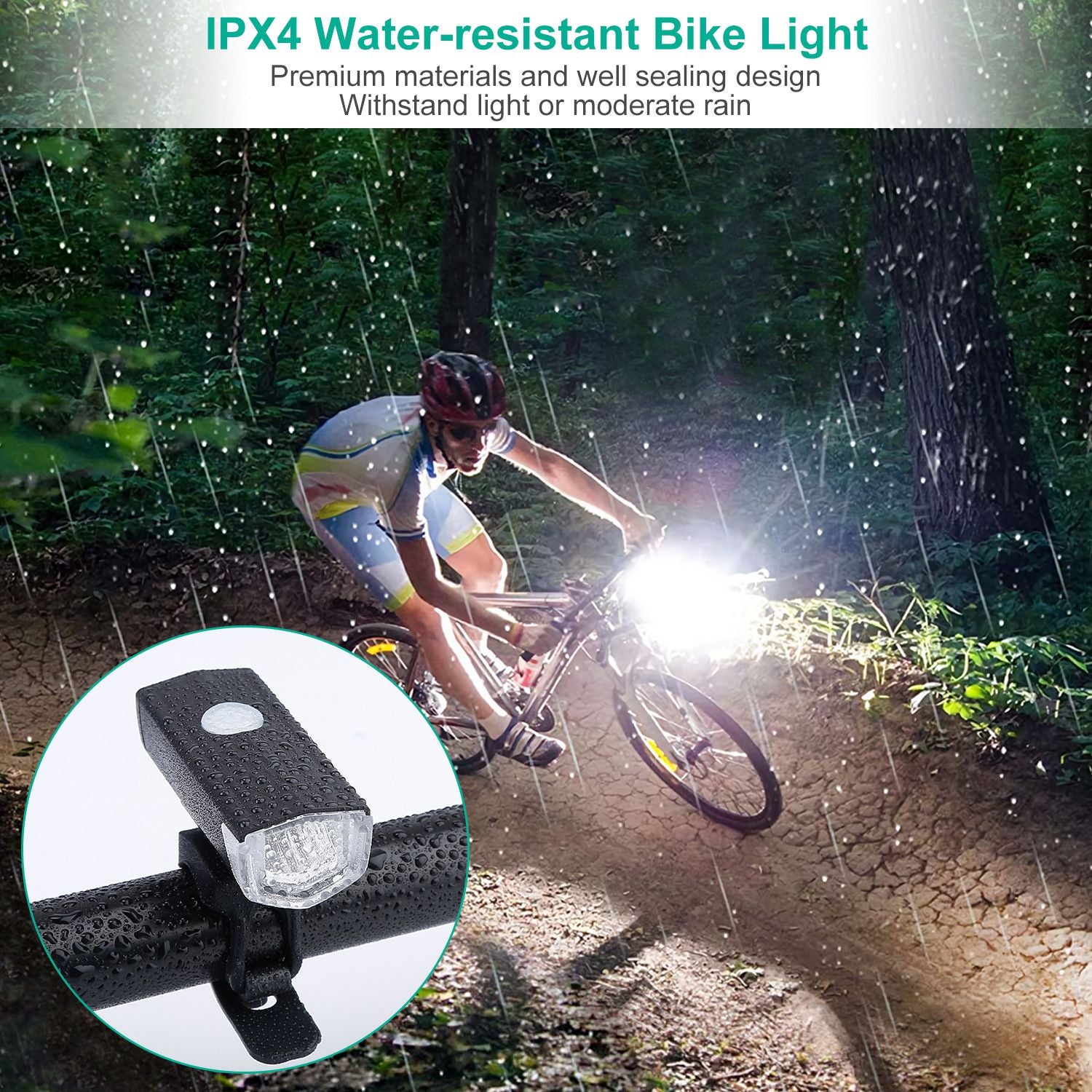 - *IPX4 Waterproof & Long-lasting*:Adopting high-grade materials and well sealing design, our bike front light and taillight are durable and can provide IPX4 water-resistant performance to withstand light or moderate rain. After being fully charged for 3hrs, it can work up to 12hrs.