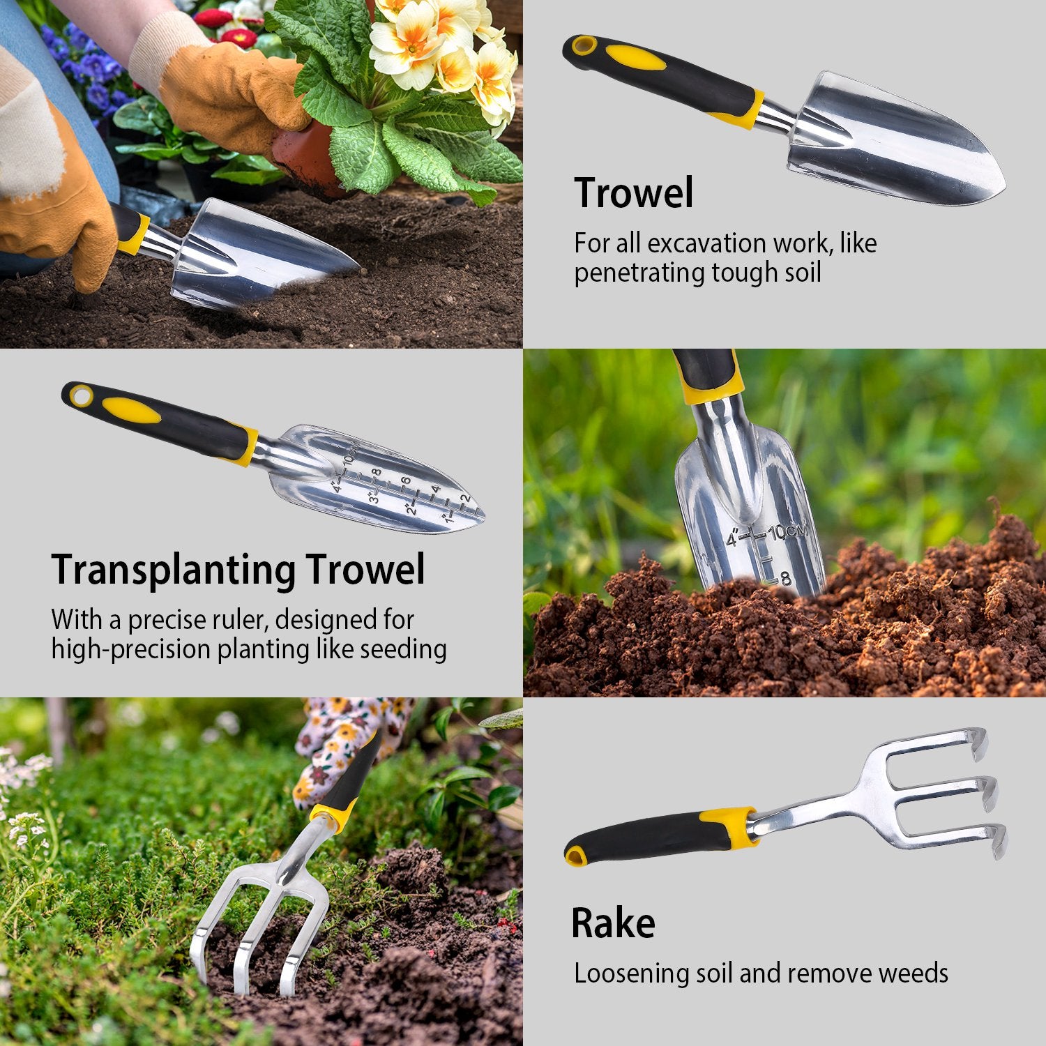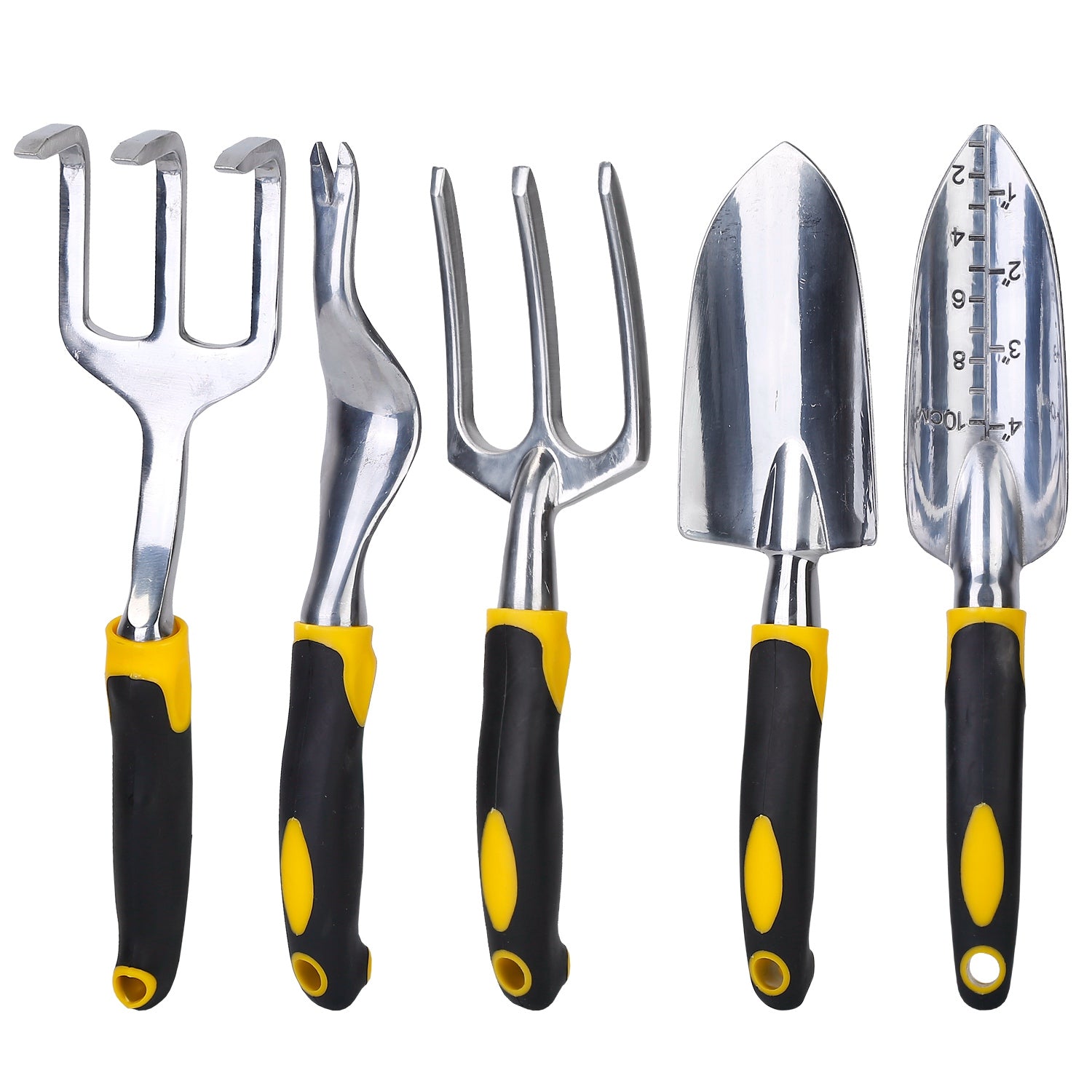5Pcs Garden Tool Set Heavy Duty Aluminum Gardening Hand Tool Kit with Non-Slip Handle Rake Trowel Weeder Shovel