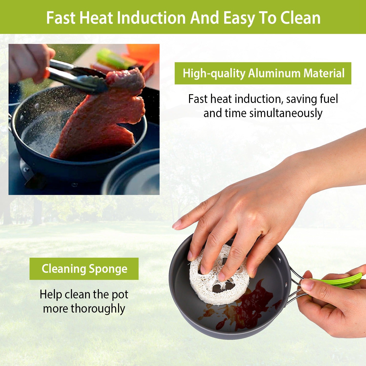 - *9Pcs Outdoor Cooking Set*:This package contains 1 pot(1.3L), 1 pan(0.7L), 1 lid, 2 bowls, 1 spoon, 1 spatula, 1 cleaning tool, and 1 storage bag. You can find everything you need for outdoor cooking in this small package.